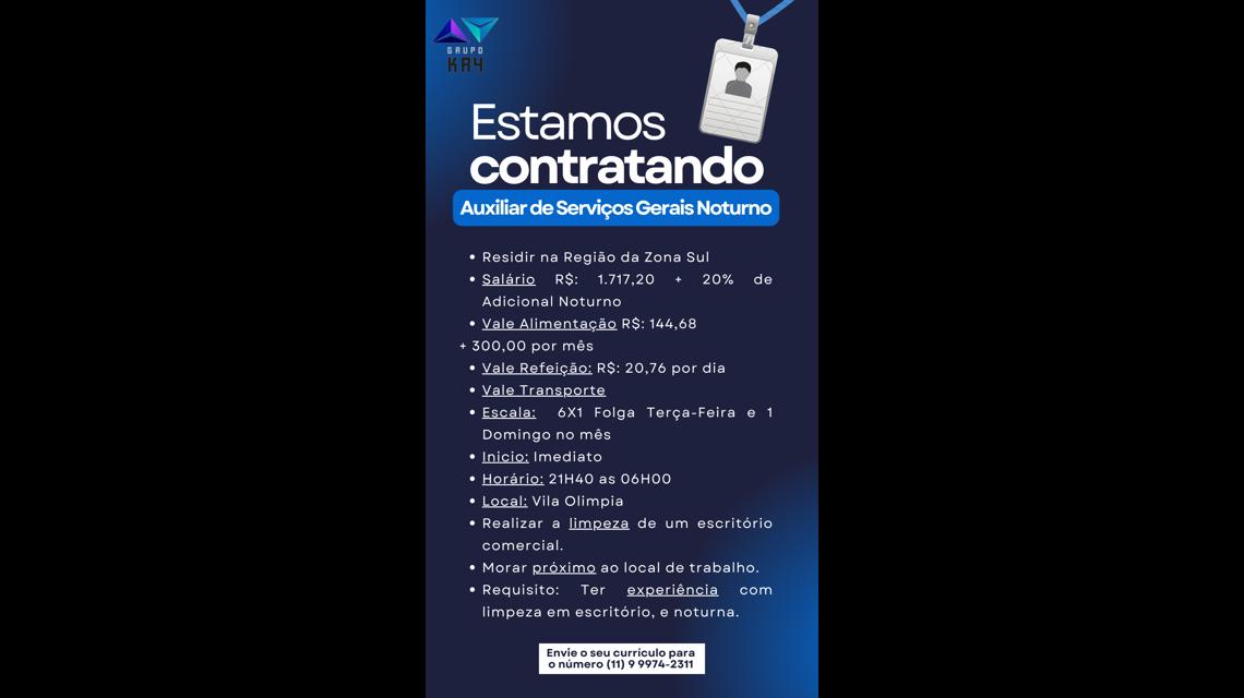 - Requisito: Ter experiência com limpeza em escritório, e noturna.